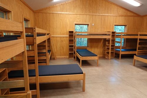 - Each side of the cabin has a large open bunk room with seven sets of bunk beds to sleep 14 individuals with a smaller, partially sectioned-off sleeping area with a single bed